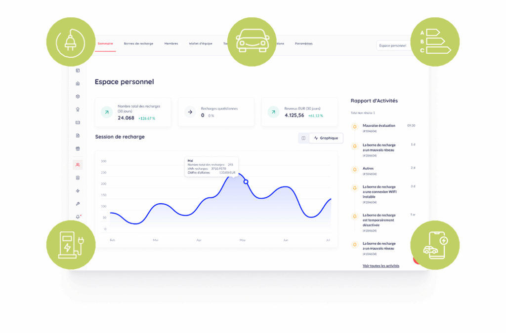 Notre plateforme de supervision et de gestion logistique offre un contrôle complet de votre réseau de bornes. Compatible avec l’ensemble des fabricants, elle permet d’optimiser la consommation d’énergie, de suivre l’activité des bornes et de maximiser l’efficacité de votre environnement.